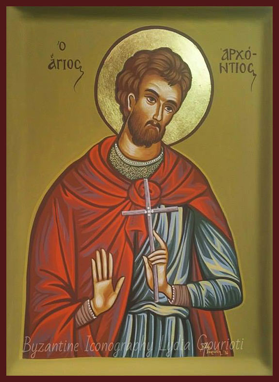Ο Άγιος Αρχοντίων μαρτύρησε δια λιμού (Λαμία είναι ένα θηρίο, το οποίο έχει μεγάλο λαιμόν. Mε το θηρίο αυτό, παρομοιάζεται εδώ ο Διάβολος).