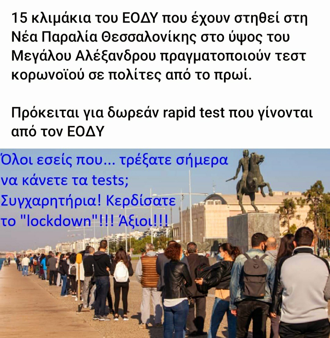 Από το πρωί κλιμάκια του ΕΟΔΥ πραγματοποιούν rapid tests κορονοϊού στη Θεσσαλονίκη. Η διαδικασία θα συνεχιστεί μέχρι τις 20:00 σήμερα.