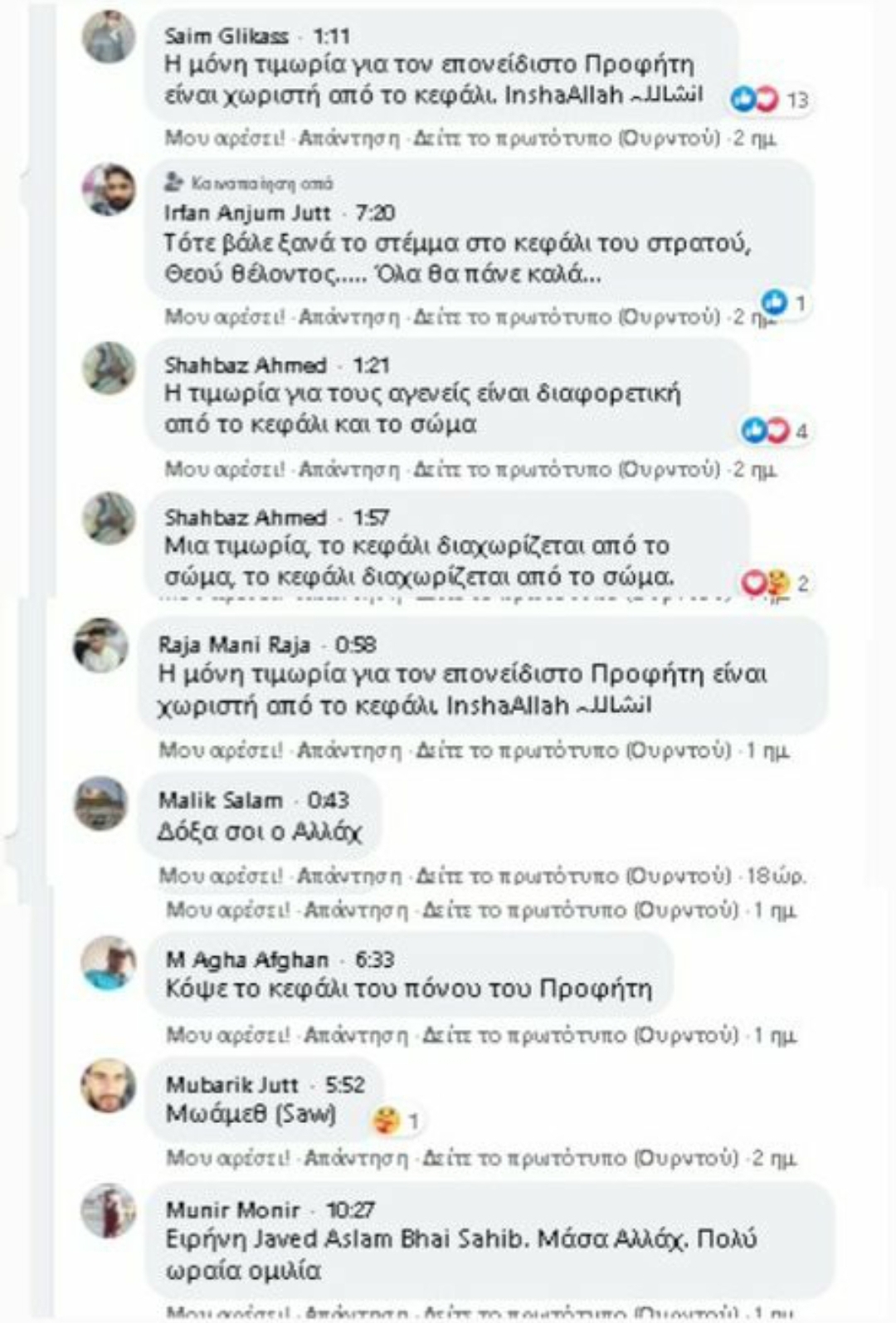 Στην σελίδα της κοινότητας "Unity" που διαχειρίζεται ο ίδιος ο Τζ.Ασλάμ, κατηγόρησε σε βίντεο που ανέβασε την Γαλλία για αντιισλαμισμό. Στα σχόλια, Πακιστανοί που διαμένουν στην Ελλάδα προτρέπουν σε αποκεφαλισμούς των ασεβών και των απίστων. Τον Δεκέμβριο είχε επαναληφθεί το ίδιο.