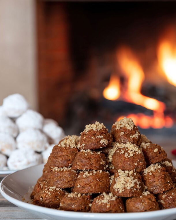 Τα βγάζουμε σε πιατέλα και τα πασπαλίζουμε με ψιλοκομμένο καρύδι ώστε να κολλήσει επάνω. Περιχύνουμε με λίγο μέλι στην πιατέλα.