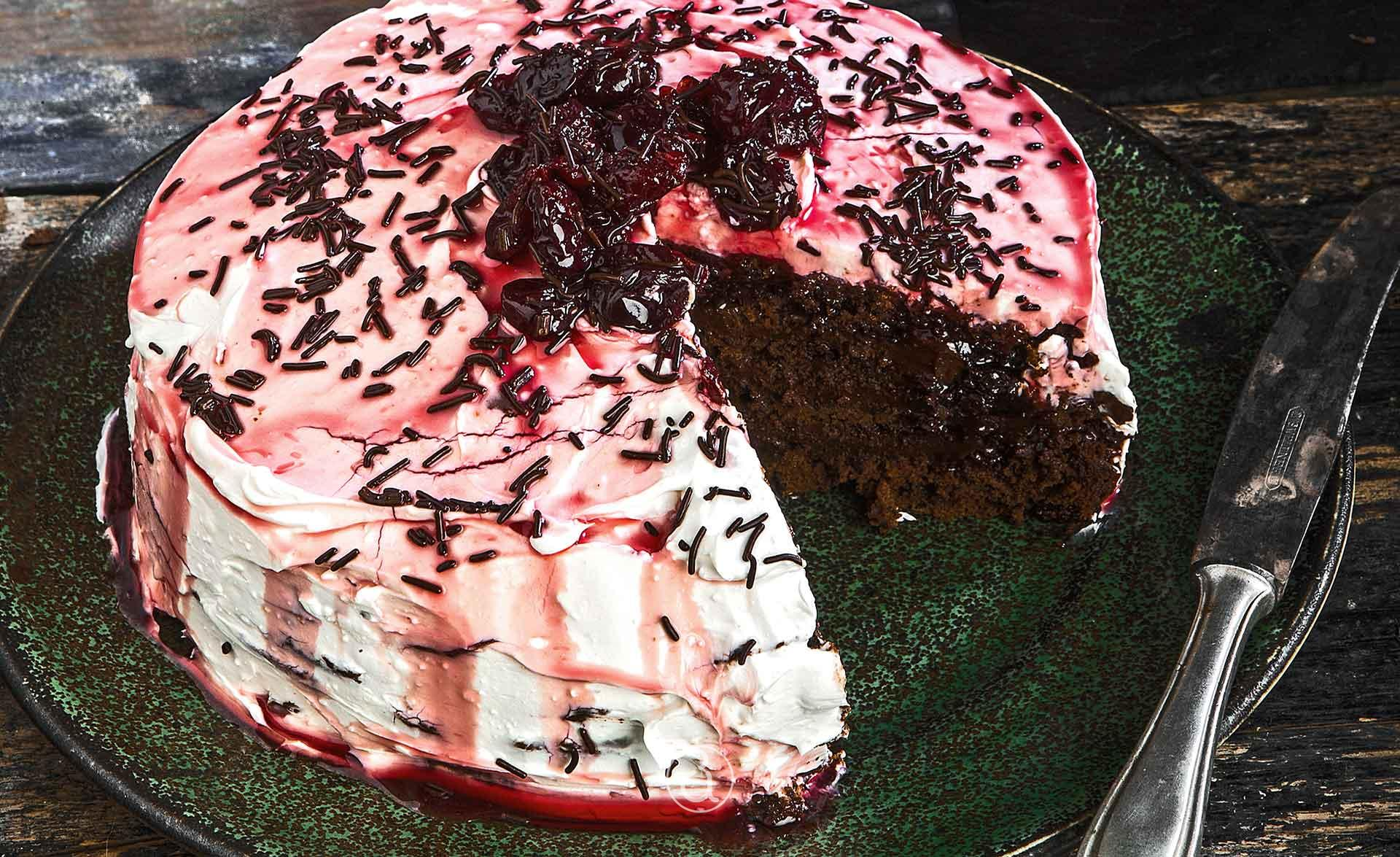 Γαρνίρουμε με καρούλια σοκολάτας και βύσσινο γλυκό.