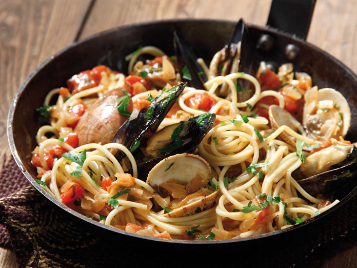 Σοτάρουμε με ελαιόλαδο σε ένα τηγάνι σε μέτρια φωτιά το κρεμμύδι και το σκόρδο και προσθέτουμε τα θαλασσινά και το πιπέρι για 5 λεπτά. Κατόπιν, τα σβήνουμε με το κρασί. Προσθέτουμε το μαϊντανό, τη ρίγανη και τις τομάτες και αφήνουμε τη σάλτσα να δέσει. Βράζουμε τα μακαρόνια για 8 με 10 λεπτά και τα σουρώνουμε. Τέλος, ρίχνουμε τα μακαρόνια στο τηγάνι με τα θαλασσινά, τα ανακατεύουμε καλά και τα σερβίρουμε σε μια μεγάλη πιατέλα