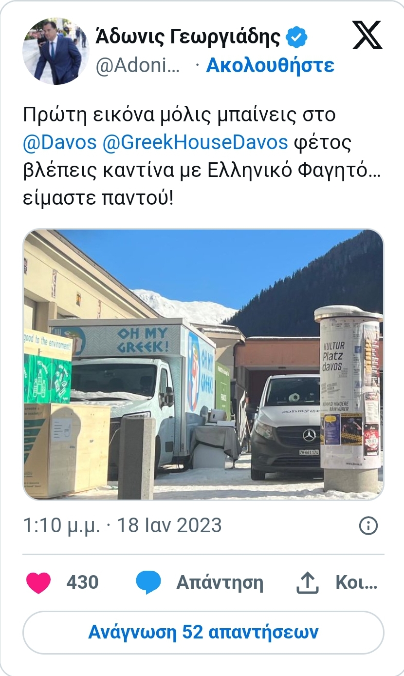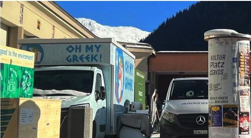 Η καντίνα βέβαια ουδεμία σχέση έχει με την ελληνική επίσημη αντιπροσωπεία ή το Greek House Davos. «Κατεβαίνουμε πρώτη φορά εδώ, έπειτα από πρόσκληση τοπικού εστιατορίου που όπως καταλαβαίνετε δεν προλαβαίνει να σερβίρει τον κόσμο. Οπότε μεταξύ των τριών καντινών που στήθηκαν στον περιβάλλοντα χώρο είναι και η δική μας», λέει ο Αλέξανδρος – Άλεξ – Σγουρός, ομογενής επιχειρηματίας με καταγωγή απ’ την Κόνιτσα ο οποίος μαζί με τον πατέρα του, Νίκο, λειτουργεί στην Ελβετία την αλυσίδα καταστημάτων και καντινών «Oh My Greek!».