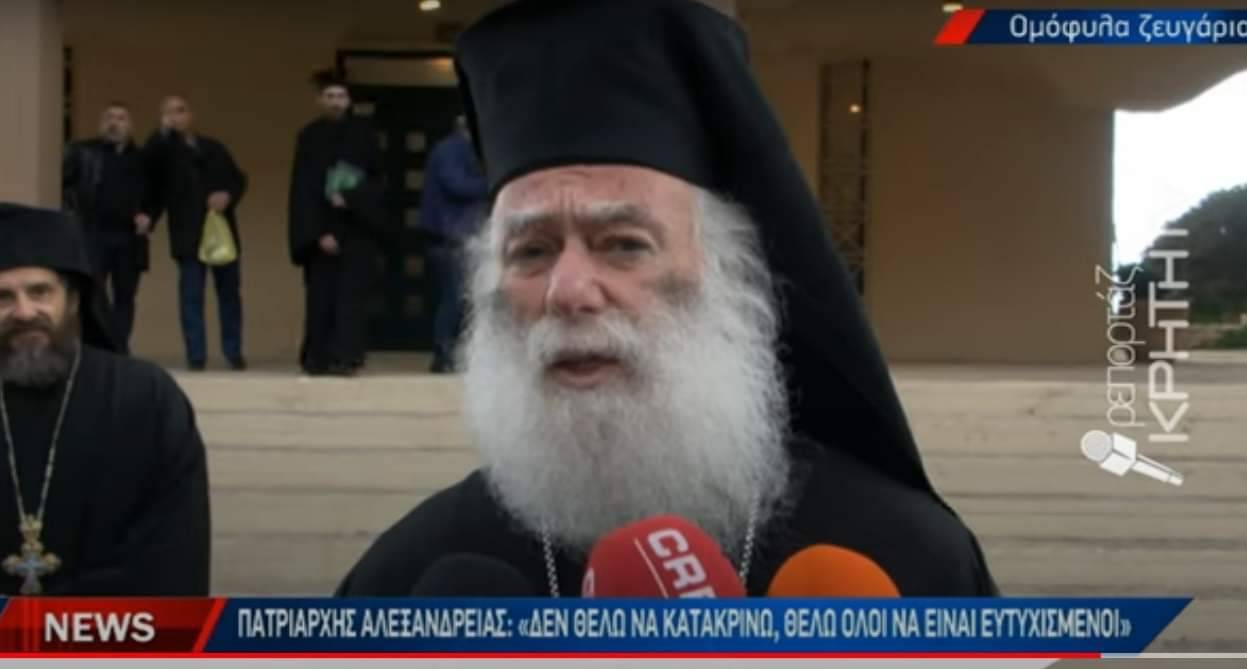 Αὐτὰ βρῆκε νὰ πεῖ γιὰ τὸ μέγα ζοφερὸ καὶ ἀποτρόπαιο θέμα τῶν ἡμερῶν ὁ γνωστὸς λυκοποιμένας ποὺ παριστάνει τὸν Πατριάρχη Ἀλεξανδρείας. Κάντε ὅποια ἀνωμαλία θέλετε λοιπόν, νὰ εἶστε εὐτυχισμένοι, ἀγάπη μόνο, ὁ Θεὸς ὅλα τά δέχεται καὶ ὁ καλὸς ὁ μύλος ὅλα τὰ ἀλέθει! Καὶ εἶναι καὶ πολλοί ἄλλοι βεβαίως ποὺ φρονοῦν τὰ αὐτὰ καὶ τὰ διαλαλοῦν ποικιλοτρόπως.
