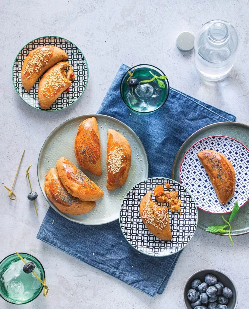 Αλείφουμε με τον κρόκο, πασπαλίζουμε με σουσάμι και παπαρουνόσπορο. Ψήνουμε τα πιτάκια για 25΄ να ροδίσουν καλά και σερβίρουμε.