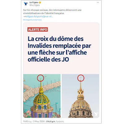 Παρίσι 2024: Αντιδράσεις για την γαλλική σημαία – Ξήλωσαν τους σταυρούς και έβαλαν βέλος σε αφίσα!