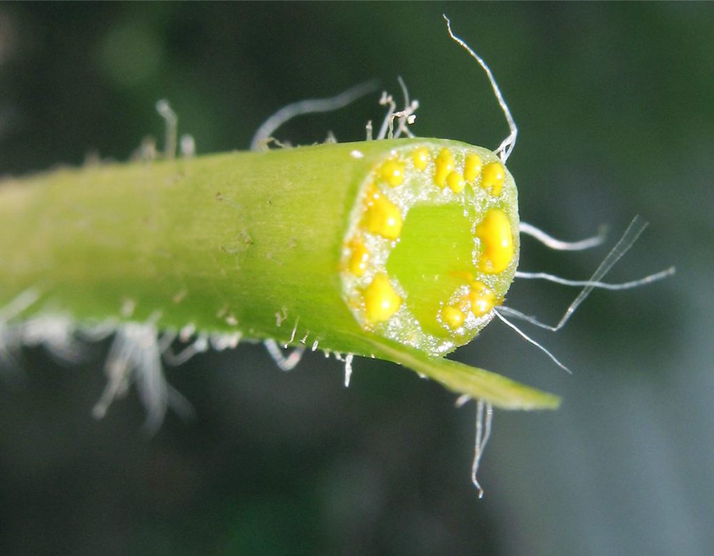 Στέλεχος κούφιο, διχαλωτό. Ολα τα μέρη του φυτού περιέχουν ένα κίτρινο γάλα.
