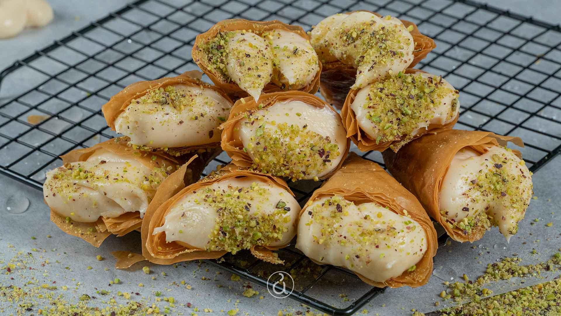 Βουτάμε τα τρίγωνα στο σιρόπι. Τα αφήνουμε σε πιατέλα. Γεμίζουμε αφού κρυώσουν τελείως γεμίζοντας κορνέ ζαχαροπλαστικής με την κρέμα βανίλιας.