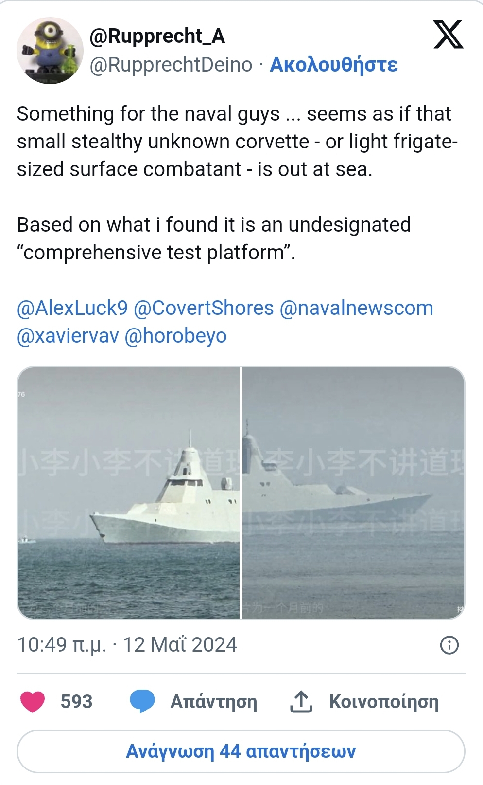 Επιστρέφοντας στην πολύ ενδιαφέρουσα κορβέτα του Πεκίνου, να σας ενημερώσουμε ότι οι πρώτες φωτογραφίες του σκάφους δημοσιεύθηκαν στα μέσα κοινωνικής δικτύωσης κατά το Σαββατοκύριακου που μας πέρασε. Δεν γνωρίζουμε όμως με ακρίβεια πότε απέπλευσε το πλοίο από το λιμάνι του ούτε εάν έχει ήδη επιστρέψει σε αυτό.