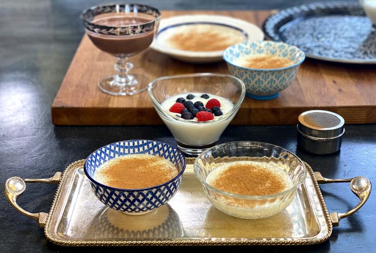 Όπως είναι ζεστό, μοιράζουμε μίγμα σε 6 μπολάκια ή σε 6 κολονάτα ποτήρια.
