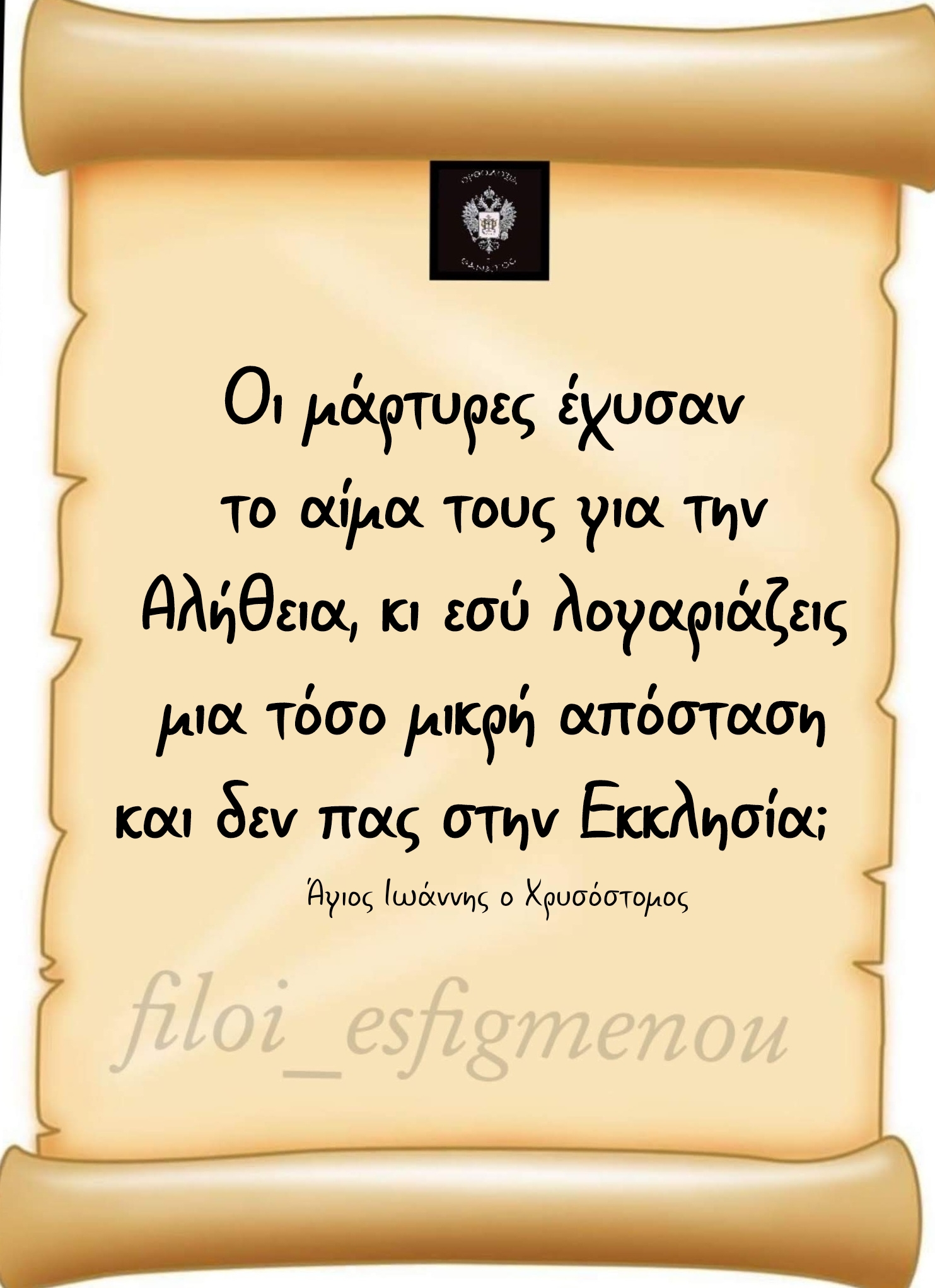 Οι μάρτυρες έχυσαν το αίμα τους για την Αλήθεια, κι εσύ λογαριάζεις μια τόσο μικρή απόσταση; Εκείνοι θυσίασαν τη ζωή τους για το Χριστό, κι εσύ δεν θέλεις ούτε λίγο να κοπιάσεις; Ο Κύριος πέθανε για χάρη σου, κι εσύ Τον περιφρονείς; Γιορτάζουμε μνήμες αγίων, κι εσύ βαριέσαι να έρθεις στο ναό, προτιμώντας να κάθεσαι στο σπίτι σου; Και όμως, πρέπει να έρθεις, για να δεις το διάβολο να νικιέται, τον άγιο να νικάει, το Θεό να δοξάζεται και την Εκκλησία να θριαμβεύει.