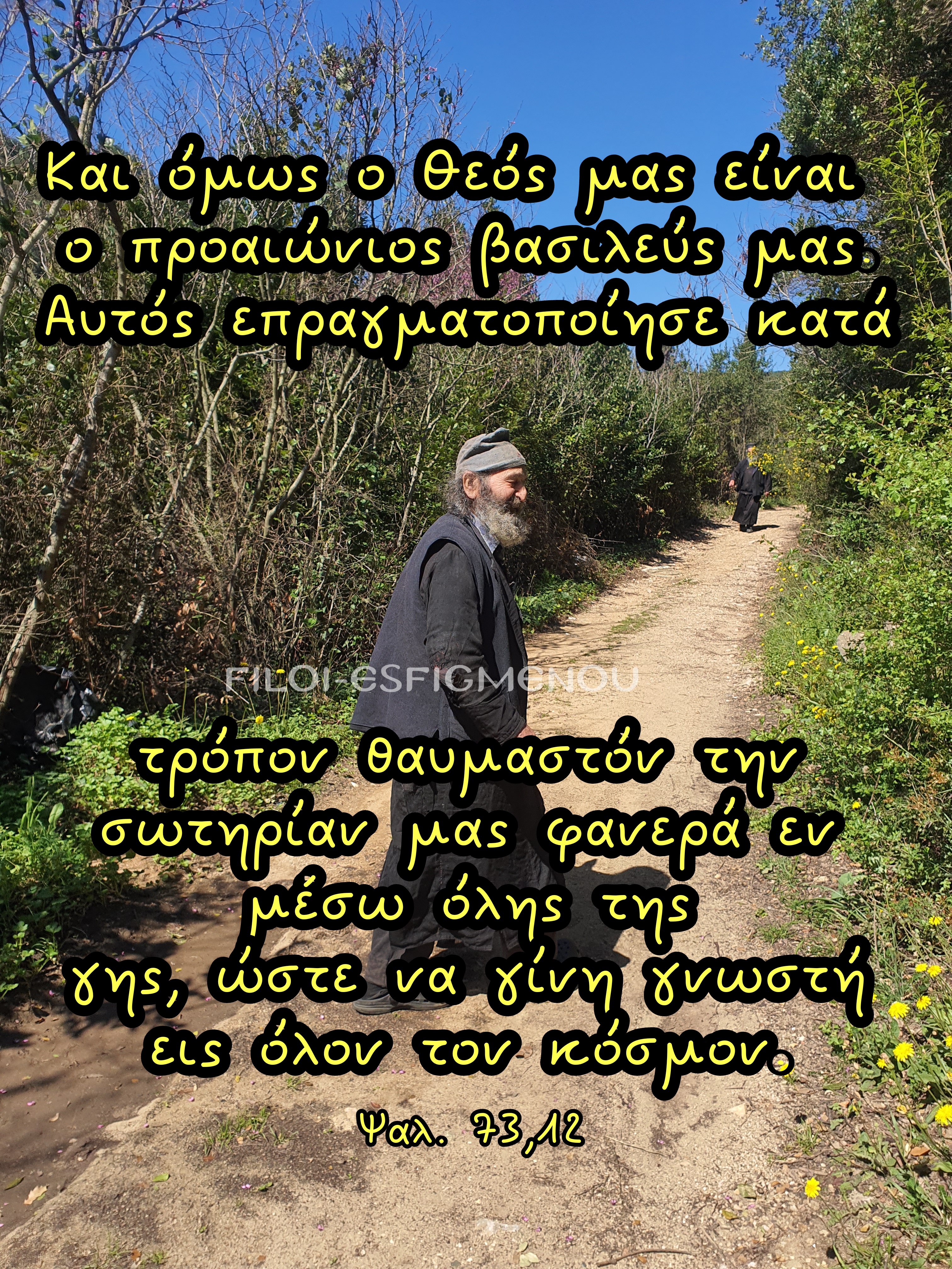 Σε μια εβδομάδα μου ήρθε η επόμενη ευχάριστη είδηση. Η γυναίκα μου ήταν έγκυος. Με το: «Νίκο, αγάπη μου», που μου είπε, θυμήθηκα τα λόγια του γέροντα. «- Μη πεις τίποτα άλλο. Είσαι έγκυος!» «-Ναι, πού το ξέρεις;» «-Μου το είπε ο καλόγερος, ο φίλος μου, και είναι κοριτσάκι!»