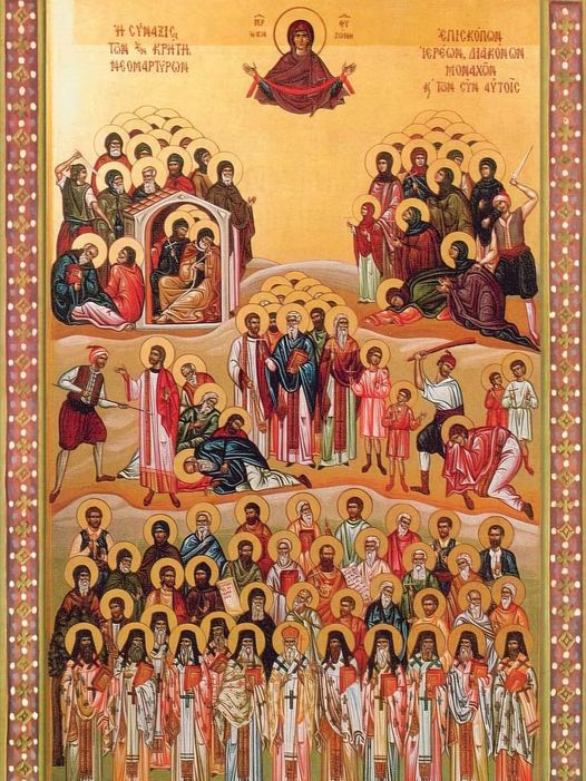 Δεῦτε ἀγαλλιασώμεθα τῷ Κυρίῳ, ἐν τῇ μνήμῃ σήμερον, τῶν εὐκλεῶν Νεομαρτύρων ὦ φιλέορτοι· δεῦτε εὐφημήσωμεν αὐτούς, διατόρως κραυγάζοντες καὶ λέγοντες· χαίρετε Ἐπισκόπων δεκάς, Ἱερέων τε δῆμος, καὶ Μοναχῶν ἰσαγγέλων σειρά, σὺν προκρίτων καὶ ἰδιωτῶν πλήθει, οἱ ἐν ἐσχάτοις ἀθλήσαντες καιροῖς, καὶ τοῦ Σωτῆρος Χριστοῦ τὸ πάθος, ἐν ἑαυτοῖς ἀναζωγραφήσαντες· οἱ τὴν ἐν Κρήτῃ ποίμνην στηρίξαντες, ὑπὲρ αὐτῆς προσκαίρου θανάτου, ὡς καρτερόψυχοι καταφρονήσαντες. Ἀλλ᾿ ὡς χάριν παῤῥησίας πλουτήσαντες, τῇ Ἁγίᾳ Τριάδι πρεσβεύετε, ἵνα ῥυσθῶμεν συμφορῶν, καὶ πάσης περιστάσεως.