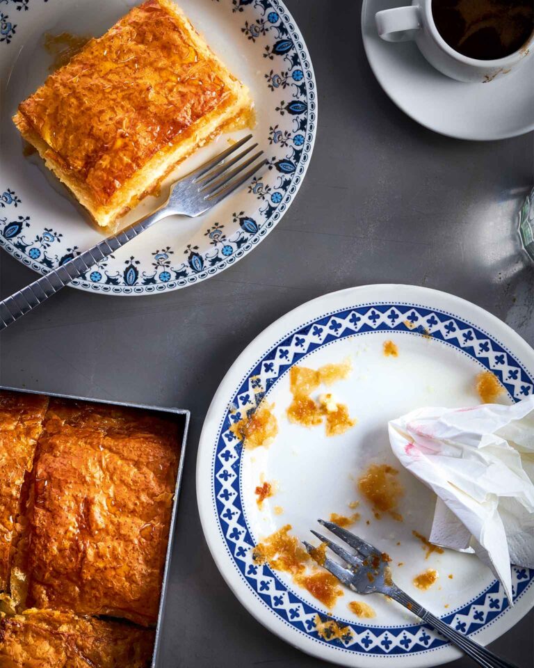 Κόβουμε τις άκρες τους ώστε να μην εξέχουν καθόλου από το ταψί ή τις στριμώχνουμε για να περάσουν ανάμεσα στο γλυκό και στα τοιχώματα του ταψιού.