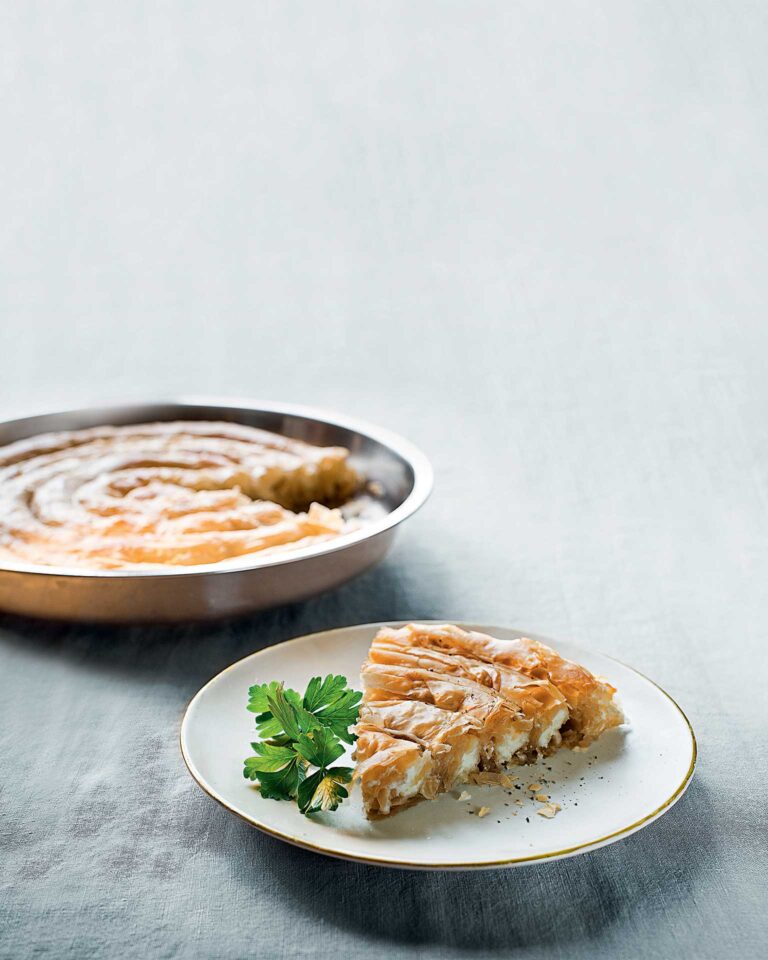 Κάθε ρολό που φτιάχνουμε το βάζουμε στο ταψί εκεί όπου τελειώνει το προηγούμενο, σχηματίζοντας έτσι μια σπείρα που να καταλήγει στο κέντρο του ταψιού.