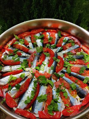 Καθαρίζουμε και πλένουμε τον γαύρο. Έχουμε έτοιμα και τα λαχανικά μας. Σε ένα ταψάκι βάζουμε λίγο ελαιόλαδο και προσθέτουμε τις λεπτές ροδέλες πατάτας. Την πιπεριά τις ντομάτες. Προσθέτουμε αλάτι, πιπέρι και μισό ποτήρι νερό. Σκεπάζουμε με λαδόκολλα. Ψήνουμε στο φούρνο για 30-35 λεπτά στους 200 βαθμούς.
