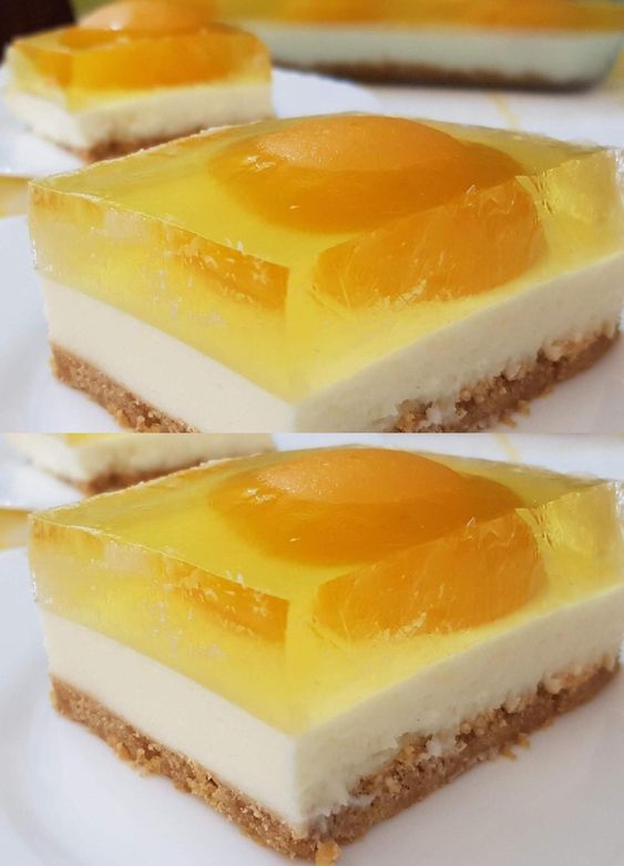 Αφού η κρέμα παγώσει βάζουμε στην επιφάνεια, στη σειρά, τις φέτες ροδάκινο κομπόστα. Αδειάζουμε το υπόλοιπο κρύο ζελέ (τα 2 πακέτα) και βάζουμε το γλυκό στο ψυγείο να παγώσει καλά (ιδανικά για όλη τη νύχτα).