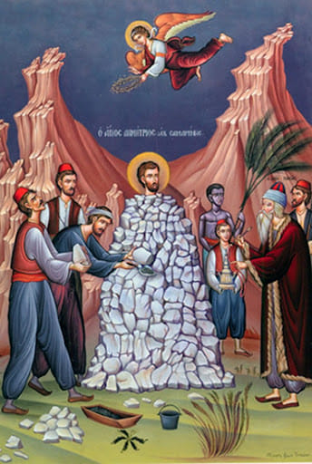 Στύλος και εδραίωμα των σκλαβωμένων Ελλήνων ο μοναχός Δημήτριος, γεννήθηκε στη Σαμαρίνα της Πίνδου στα τέλη του 18ου μ.Χ. αιώνα. Έγινε μοναχός στο μοναστήρι της Πατρίδας του, όπου με προσευχή και νηστεία εξάγνισε το σώμα και την ψυχή του. Μετά την κατάπνιξη, από τον Αλή Πασά το 1808, της επανάστασης που υποκίνησε ο παπα Ευθύμιος Βλαχάβας, ο Δημήτριος βγήκε από το μοναστήρι του και γύριζε τα χωριά κηρύττοντας τον λόγο του Θεού και διδάσκοντας υπομονή στις θλίψεις. Μετά από συκοφαντία τον συνέλαβε ο Αλή Πασάς και τον φυλάκισε. Κατόπιν διέταξε τον άγριο βασανισμό του. Έτσι οι δήμιοι με καλαμένιες ακίδες τρύπησαν τους βραχίονες του και έπειτα τις έμπηξαν στα νύχια των χεριών και των ποδιών του. Στη συνέχεια έσφιξαν το κεφάλι του σε μέγγενη και κατόπιν αφού τον κρέμασαν ανάποδα τον έκαιγαν από κάτω με φωτιά. Βλέποντας κάποιος Τούρκος την γενναιότητα του Δημητρίου, πίστεψε στον Χριστό και έπειτα μαρτύρησε. Ύστερα ο Αλή Πασάς έκτισε τον Δημήτριο μέσα σ' έναν τοίχο, αφήνοντας μόνο το κεφάλι του απ' έξω για να παρατείνει το μαρτύριο. Ο Μάρτυρας άντεξε έτσι 10 ημέρες. Τελικά παρέδωσε το πνεύμα του στον Θεό, το έτος 1808. Το μαρτύριο του συνέγραψε ο πρόξενος της Γαλλίας στα Ιωάννινα Ε. Pouqueville.