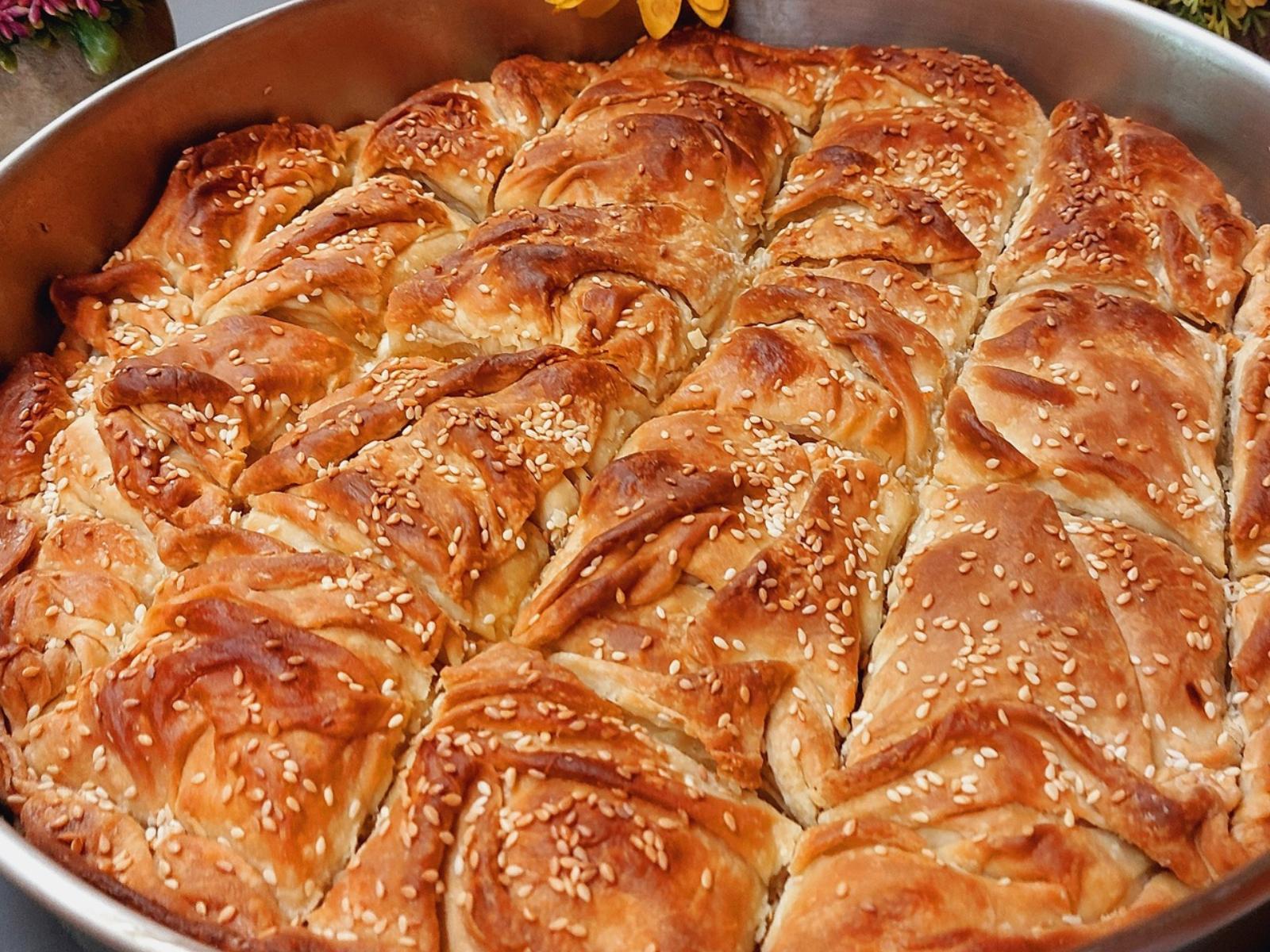 Από πάνω βάζουμε τα άλλα 4 φύλλα λαδώνοντάς τα μεταξύ τους. Το τελευταίο φύλλο το τσαλακώνουμε λίγο. Αλείφουμε με ελαιόλαδο, χαράζουμε την τυρόπιτα, ψεκάζουμε με νερό, πασπαλίζουμε με σουσάμι και ψήνουμε για 60-70 λεπτά στους 200 βαθμούς Κελσίου, στις αντιστάσεις.