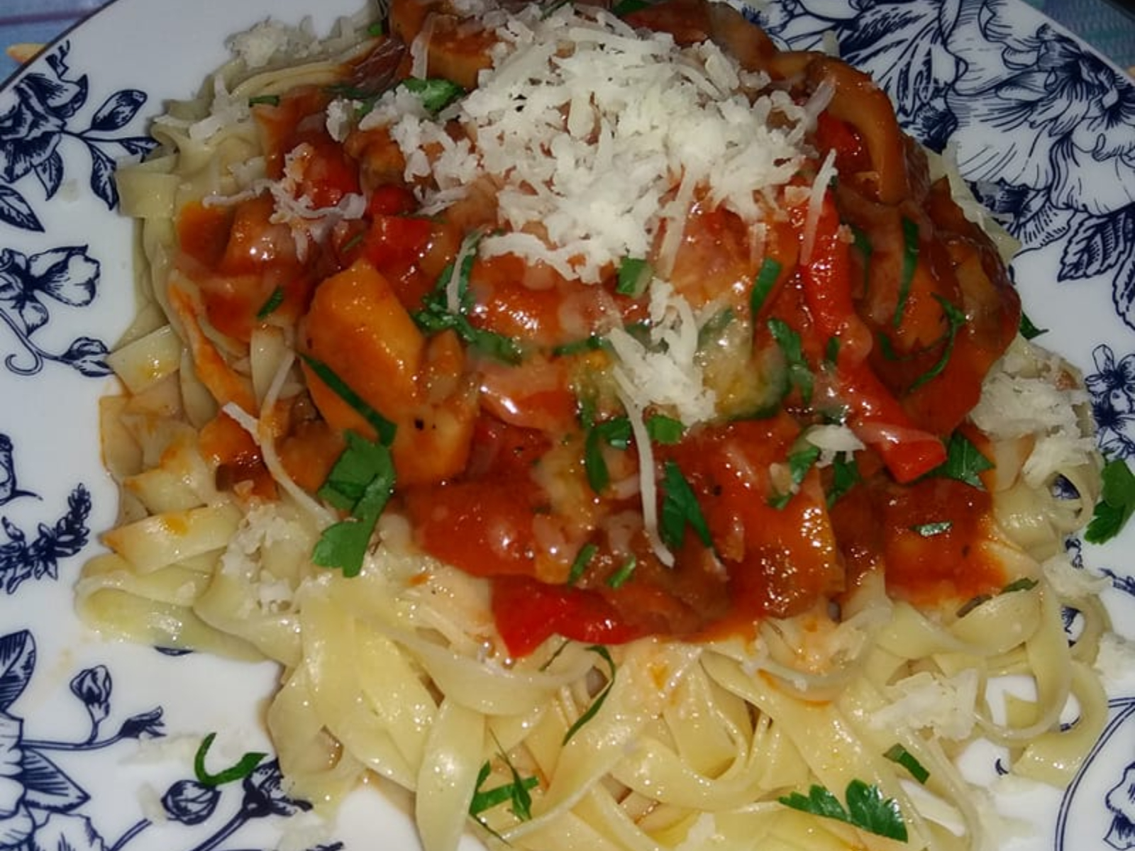 Αρχικά βράζουμε τις ταλιατέλες σε μία κατσαρόλα με αλατισμένο νερό, σύμφωνα με τις οδηγίες της συσκευασίας. Βάζουμε σε μία κατσαρόλα το ελαιόλαδο και μόλις κάψει σοτάρουμε το κρεμμύδι ψιλοκομμένο, την κόκκινη πιπεριά κομμένη σε ροδέλες χωρίς τα σπόρια της και τα μανιτάρια, χωρίς τους ζωμούς της κονσέρβας.