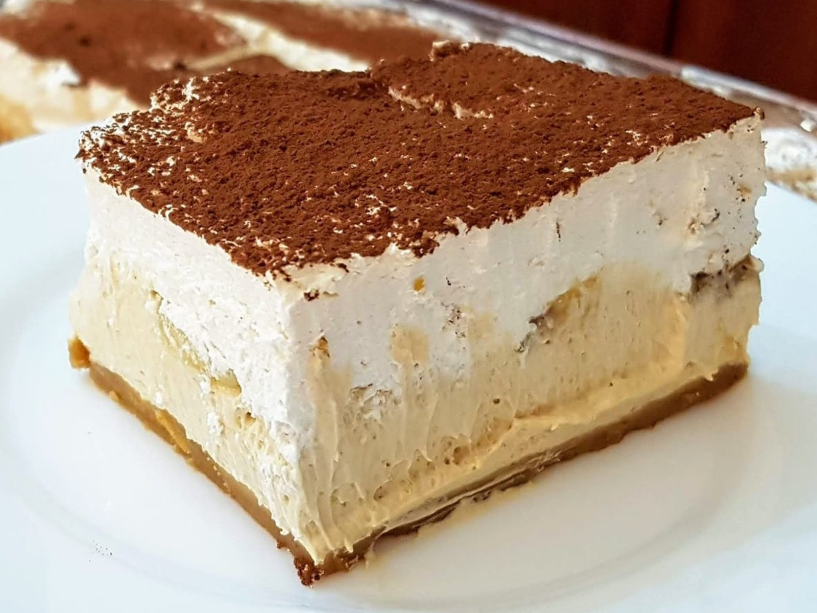 Στρώνουμε τις φέτες μπανάνας πάνω από την κρέμα και από πάνω απλώνουμε την σαντιγί. Πασπαλίζουμε με το κοσκινισμένο άγλυκο κακάο και βάζουμε το γλυκό στο ψυγείο μέχρι να παγώσει καλά. Σερβίρουμε και απολαμβάνουμε.