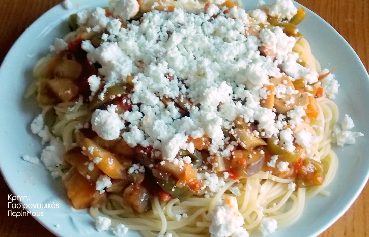 Μακαρονάδα με σάλτσα μελιτζάνας και πιπεριάς και ξινομυζήθρα