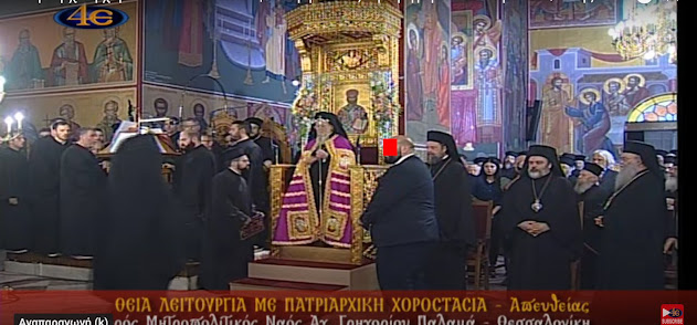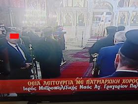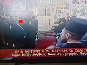 Αυτό που πραγματικά όπως απουσίαζε, ήταν οι πιστοί!!! Η φωτογραφία από τη ζωντανή μετάδοση της άφιξης του Βαρθολομαίου στο προαύλιο. Με εξαίρεση μία οικογένεια με συγγενικό της πρόσωπο στο αναπηρικό καροτσάκι, είδαμε άφθονους δημοσιογράφους, ασφαλίτες, και μόλις μερικούς πιστούς μετρημένους κυριολεκτικά στα δάκτυλα!