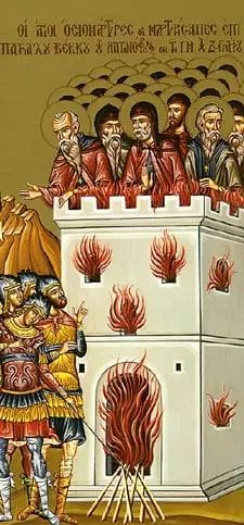 Οι Άγιοι αυτοί, σύμφωνα με τη διήγηση, από τον πύργο του μοναστηρίου, όπου ήταν κλεισμένοι, ήλεγχαν τους αιρετικούς του παπικού βασιλιά Μιχαήλ Παλαιολόγου και του επίσης παπικού Πατριάρχη Κωνσταντινούπολης Βέκκου (1275 - 1282 μ.Χ.). Τότε με εντολή του βασιλιά, στις 10 Οκτωβρίου, έβαλαν φωτιά στο μοναστήρι και έτσι τους έκαψαν όλους ζωντανούς.