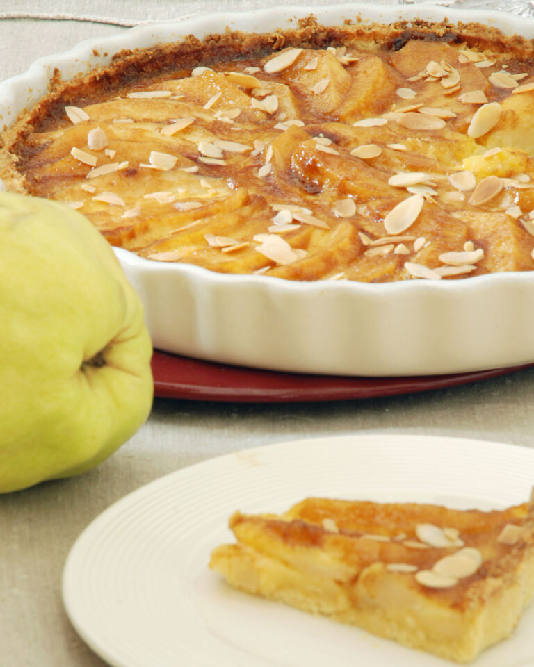 Πασπαλίζουμε με τα αμύγδαλα και σερβίρουμε την τάρτα ζεστή ή κρύα.