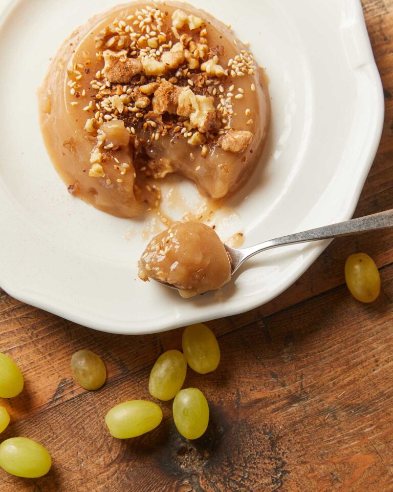 Αδειάζουμε τη μουσταλευριά σε ατομικά μπολάκια ή σε πιάτα βαθιά ή ρηχά, ή και σε ένα μεγάλο πυρίμαχο σκεύος. Την πασπαλίζουμε όσο είναι ακόμα ζεστή με καβουρδισμένο σουσάμι, καρύδι και μπόλικη κανέλα – κάποιοι ρίχνουν μια ποσότητα και μέσα στη μουσταλευριά, αλλά επειδή δεν αρέσει σε όλους εγώ ρίχνω μόνο από πάνω.