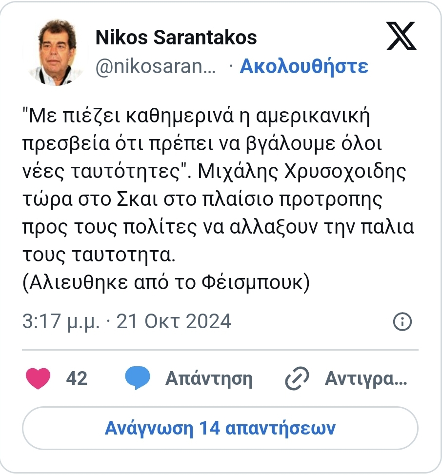 Ο Μιχάλης Χρυσοχοΐδης, κατά τη διάρκεια τηλεοπτικής του συνέντευξης το πρωί της Δευτέρας (21/10), αναφέρθηκε και στις νέες ταυτότητες τονίζοντας πώς «με πιέζει καθημερινά η αμερικανική πρεσβεία ότι πρέπει να τις βγάλουμε όλοι».