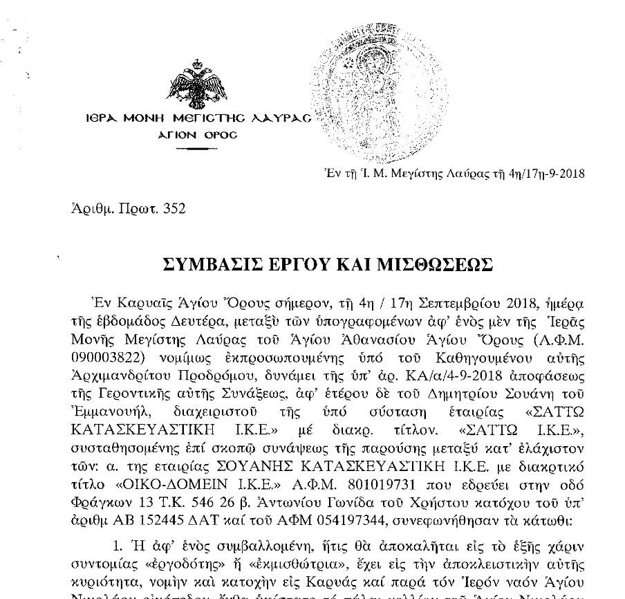 Η σύμβαση της Ιεράς Μονής Μεγίστης Λαύρας με την εταιρεία «ΣΑΤΤΩ ΙΚΕ»