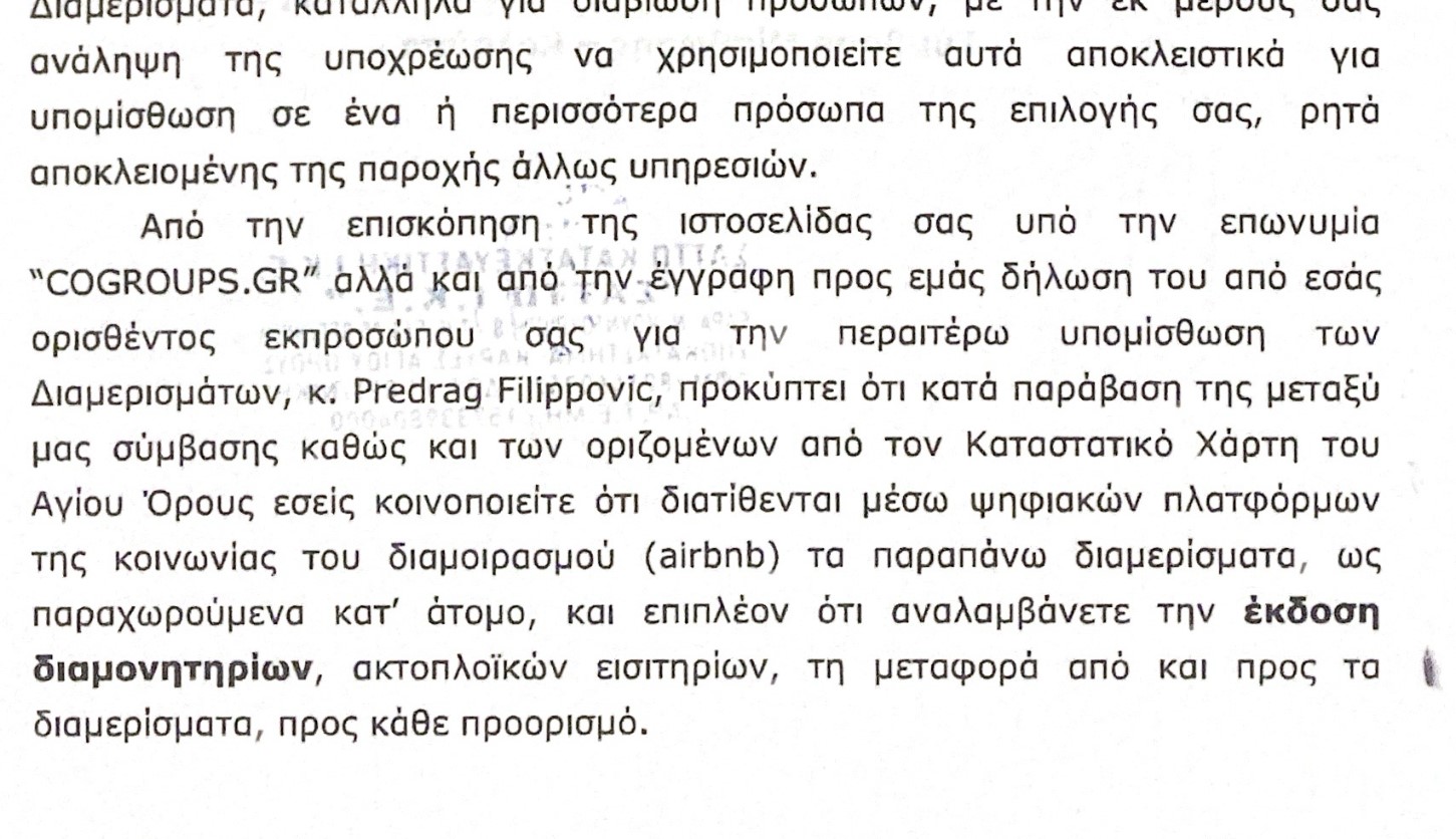 Όπως καταγγέλλει ο εκπρόσωπος της δεύτερης εταιρείας, κ.Ευάγγελος Τσικουράς, η «ΣΑΤΤΩ ΙΚΕ» κατήγγειλε μονομερώς τη σύμβαση, με πρόφαση ότι ο υπεκμισθωτής νοίκιαζε τα δωμάτια μέσω Airbnb καθώς και ότι υποσχόταν στους ενοικιαστές – προσκυνητές ότι θα τους έβγαζε διαμονητήρια, κάτι που αφορά αποκλειστική αρμοδιότητα της Ιεράς Μονής.