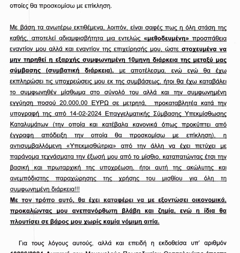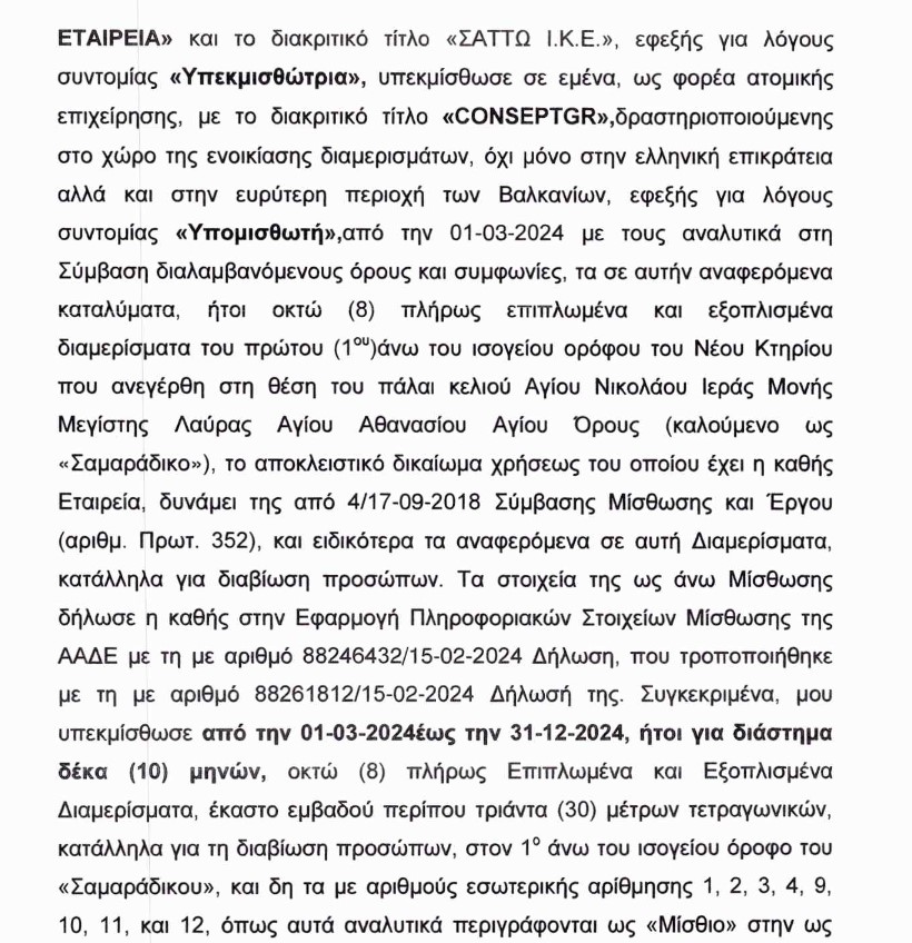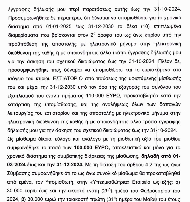 Συγκεκριμένα η εκμισθώτρια εταιρεία «ΣΑΤΤΩ ΙΚΕ» τον Μάρτιο του 2024 υπεκμίσθωσε στην ατομική εταιρεία «CONCEPTGR» την εκμετάλλευση 8 δωματίων στο εν λόγω ξενοδοχείο, για 10 μήνες, για το ποσό των 100.000 ευρώ! Στην ίδια συμφωνία υπήρχε και η αναφορά στην προοπτική και δεύτερης συμφωνίας για την εκμετάλλευση εστιατορίου.