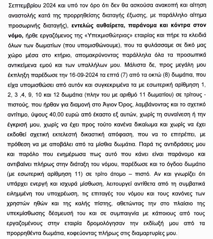 Ο κ. Τσικουράς καταγγέλλει επίσης ότι ενώ προέβη στη συνολική καταβολή 80.000 ευρώ (δύο δόσεις των 30.000 ευρώ καθώς και άλλες 20.000 ευρώ ως εγγύηση) δεν του επιτράπηκε να λειτουργήσει τον ξενώνα ενώ μάλιστα του κοινοποιήθηκε η έξωση από την Ιερά Μονή Μεγίστης Λαύρας.