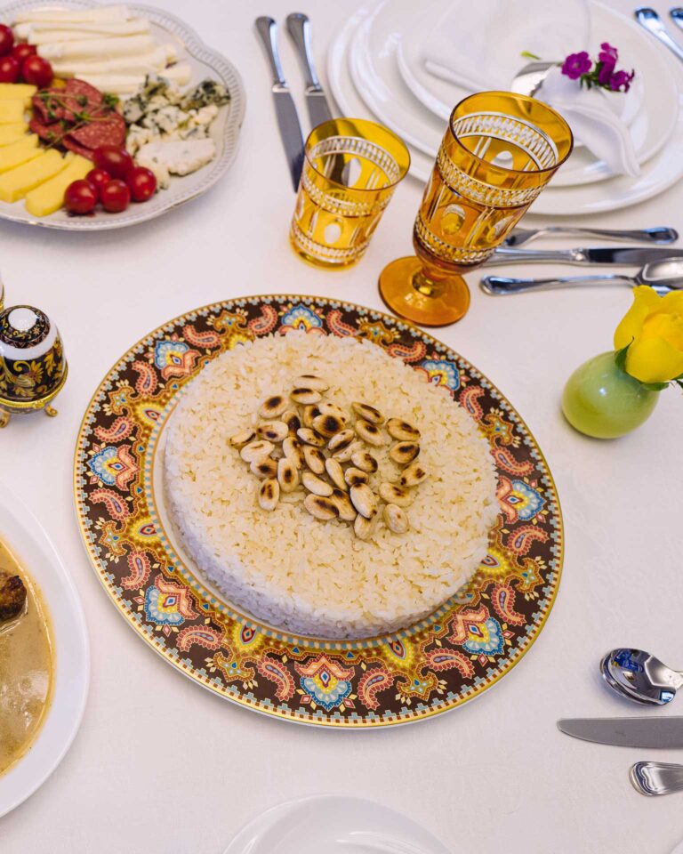 Για το πιλάφι, ξεκινάμε ζεσταίνοντας σε μια φαρδιά κατσαρόλα το βούτυρο σε μέτρια φωτιά και, όταν λιώσει, ρίχνουμε το ρύζι και το αλάτι. Σοτάρουμε για 2 λεπτά, μέχρι να γυαλίσουν καλά οι κόκκοι του.