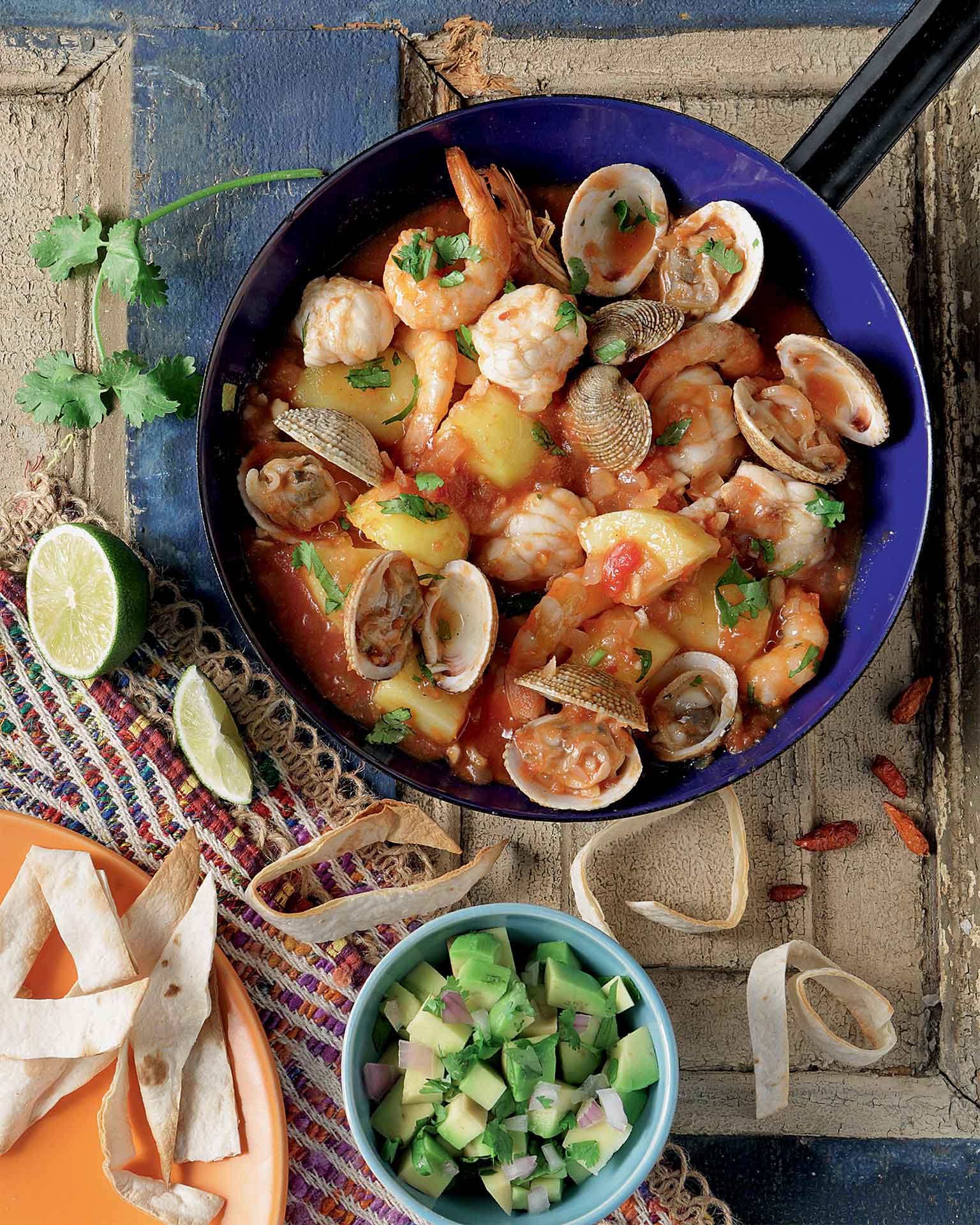 Ψάρι και θαλασσινά με πατάτες, καυτερές πιπεριές και ντομάτα