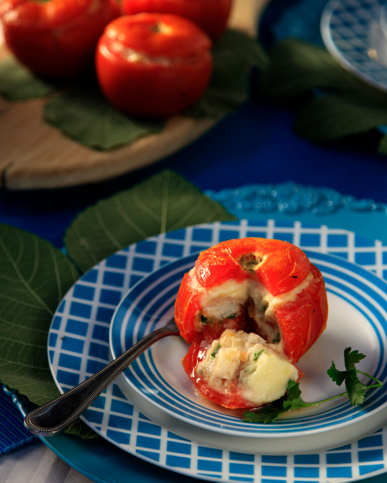 Ντομάτες γεμιστές με ψάρι και πουρέ πατάτας