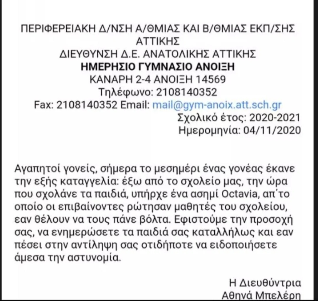 Συγκεκριμένα, το περιστατικό έλαβε χώρα στο Γυμνάσιο της Άνοιξης, όταν αναβάτες ενός ασημί οχήματος περίμεναν καρτερικά έξω από το σχολείο μέχρι να σχολάσουν οι μαθητές, προτείνοντας τους να τους πάνε βόλτα.