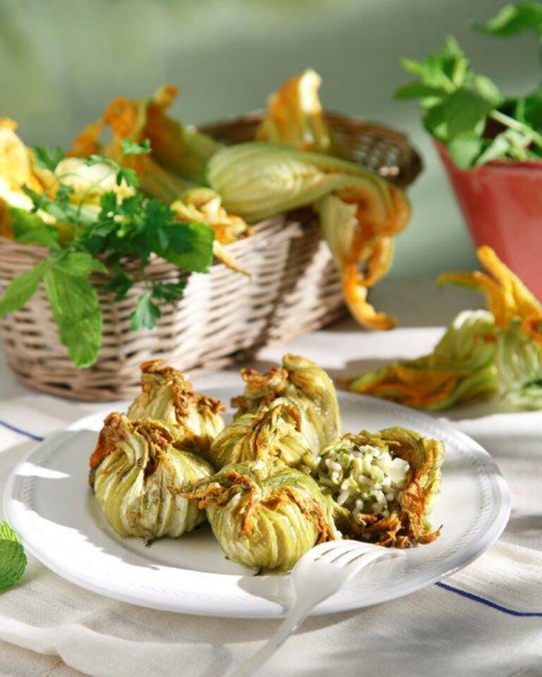 Κολοκυθοανθοί στον φούρνο, με ρύζι και μυρωδικά