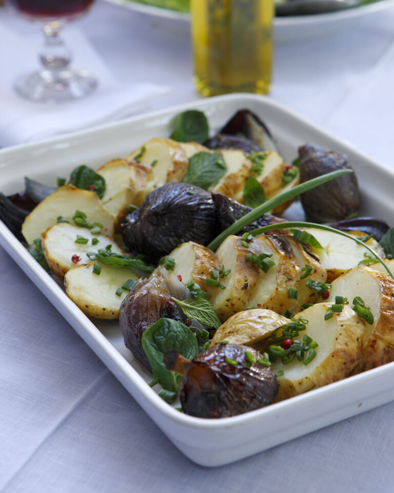 Πατάτες ψητές με κρεμμύδια και ροζ πιπέρι