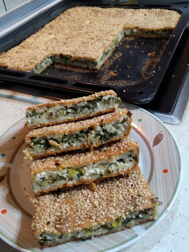 Αλείφουμε με ελαιόλαδο ένα ταψί 46×38 εκ. και το πασπαλίζουμε με σουσάμι.