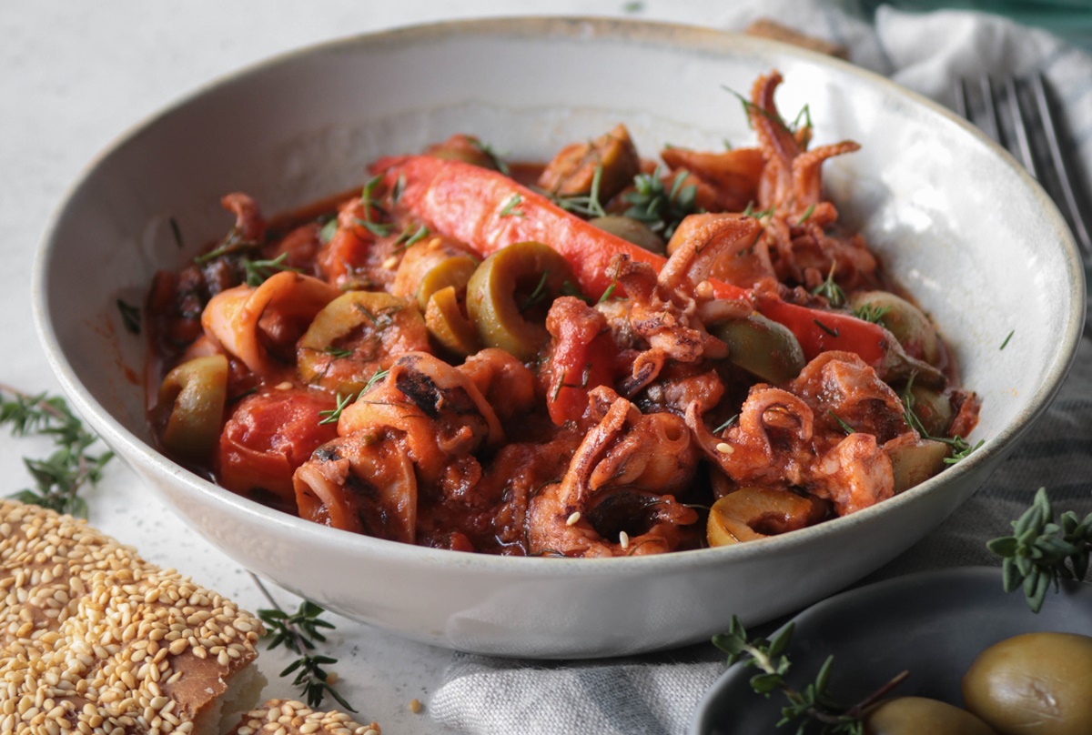 Ψητό καλαμάρι με πικάντικη σάλτσα πιπεριάς
