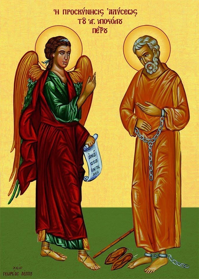 Ο Ηρώδης έβαλε τους Ιουδαίους και συνέλαβαν τον Απόστολο Πέτρο κατά τις ημέρες της εορτής των αζύμων. Και όταν τον έπιασε, τον έβαλε στην φυλακή. Τη νύκτα, πριν την ημέρα κατά την οποία ο Ηρώδης έμελλε να τον παρουσιάσει στον λαό, ο Απόστολος Πέτρος κοιμόταν μεταξύ δύο στρατιωτών και φρουροί φύλαγαν μπροστά στο κελί του. Ξαφνικά ήλθε Άγγελος Κυρίου και έλαμψε φως στο κελί. Αφού κτύπησε την πλευρά του Πέτρου, τον ξύπνησε και του είπε: «Σήκω γρήγορα». Και έπεσαν οι αλυσίδες από τα χέρια του.