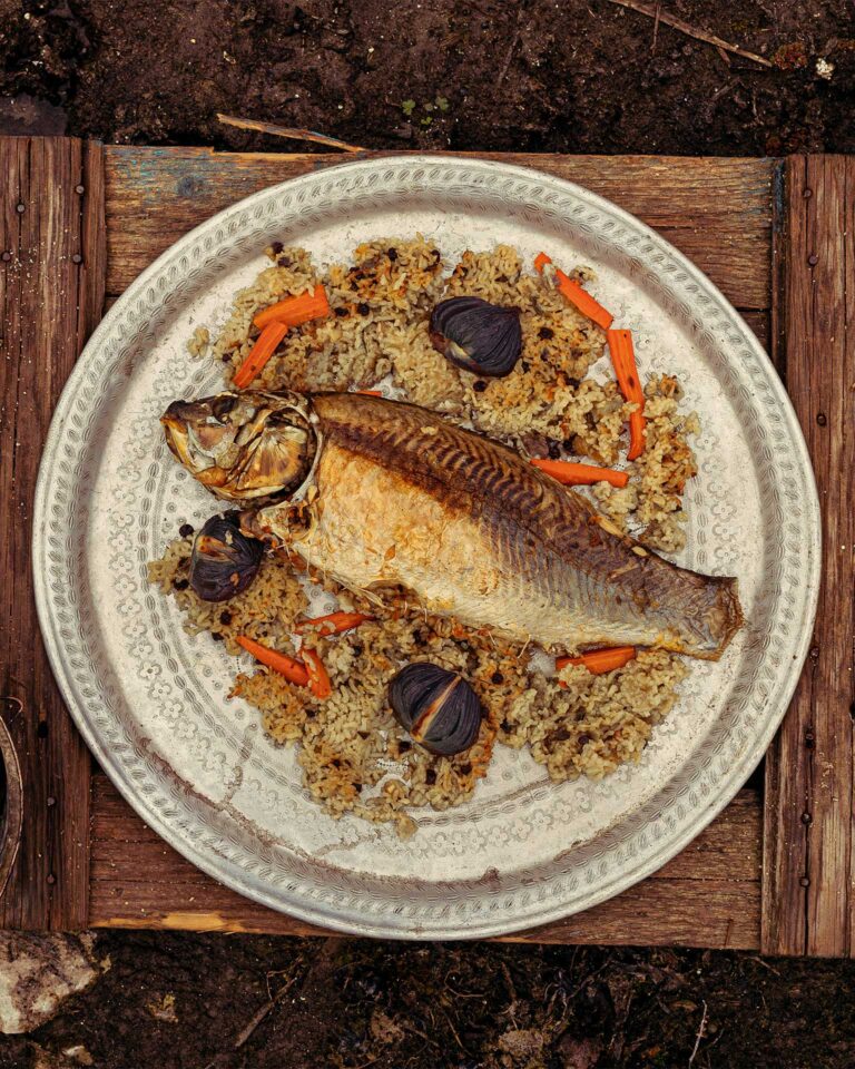Περιχύνουμε με τον υπόλοιπο ζωμό (ή νερό) και ραντίζουμε ψάρι και γέμιση του ταψιού με το υπόλοιπο ελαιόλαδο.