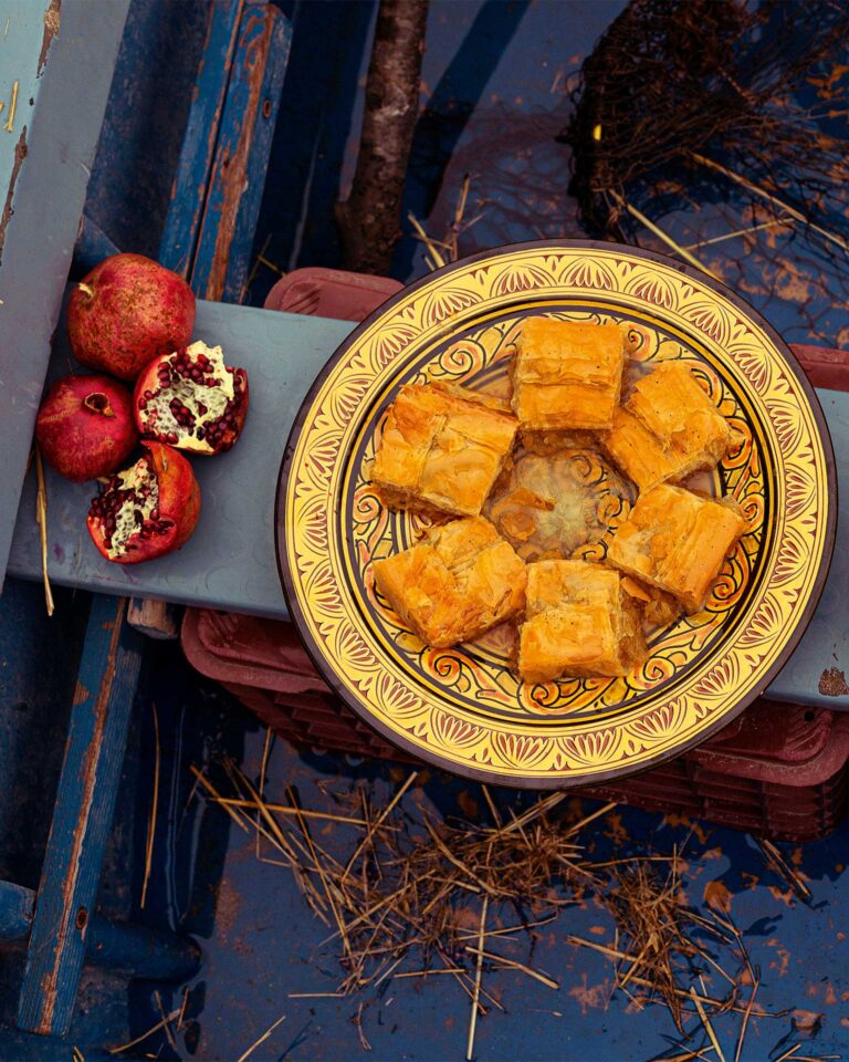Βουτυρώνουμε καλά την επιφάνεια και χαράσσουμε τον μπακλαβά σε κομμάτια (μικρά τετράγωνα ή καρεδάκια).