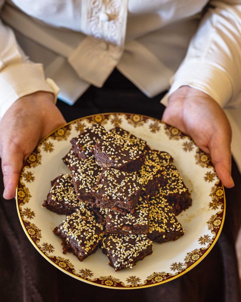 Το αφήνουμε να σφίξει λίγο και το σερβίρουμε κομμένο σε μικρά τετράγωνα ή μακρόστενα κομμάτια.