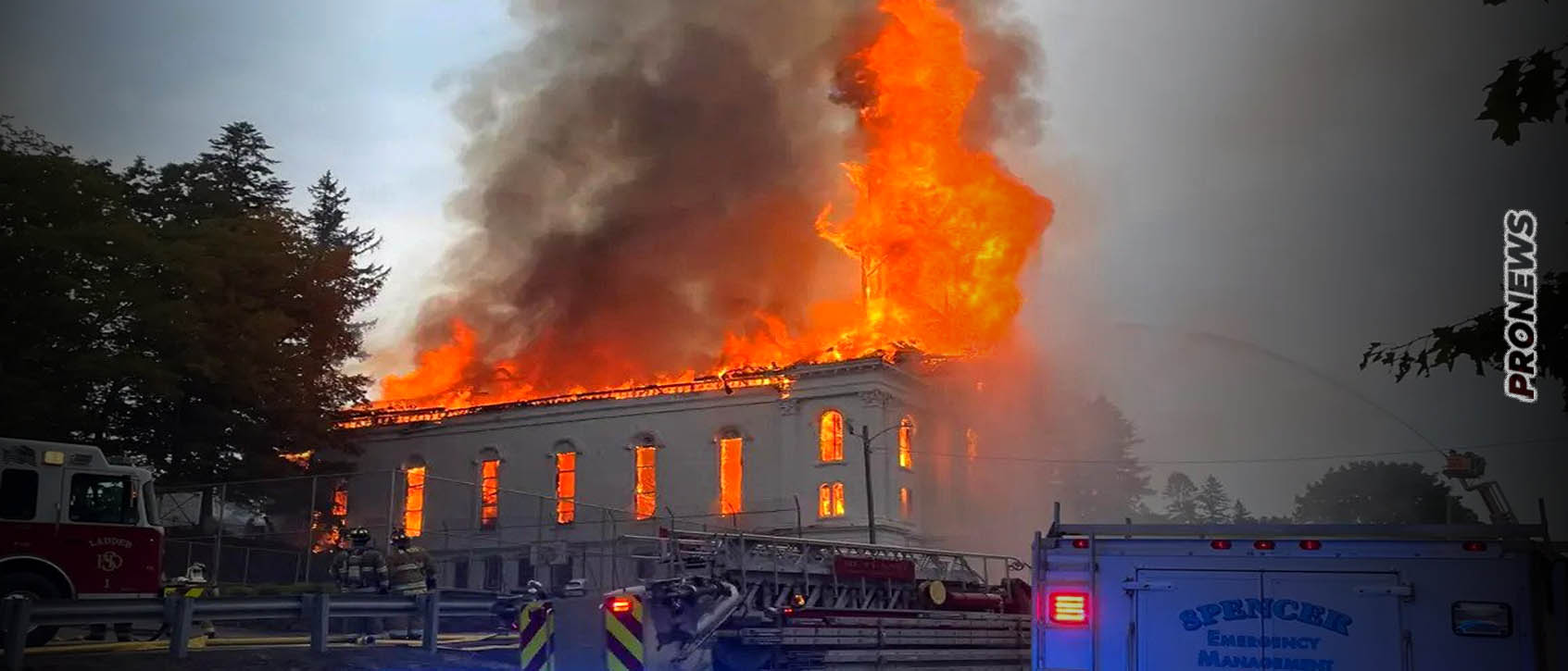 Τα πλάνα δείχνουν φλόγες και πυκνός μαύρος καπνός να καταστρέφουν την First Congregational Church στο Spencer της Μασαχουσέτης, περίπου 90 μίλια έξω από τη Βοστώνη. Στο βίντεο ακούγονται οι θεατές να ουρλιάζουν καθώς το κωδωνοστάσιο της προτεσταντικής εκκλησίας η οποία είχε κτιστεί το 1863 πέφτει, εκτοξεύοντας περισσότερη φωτιά και καπνό στον αέρα.