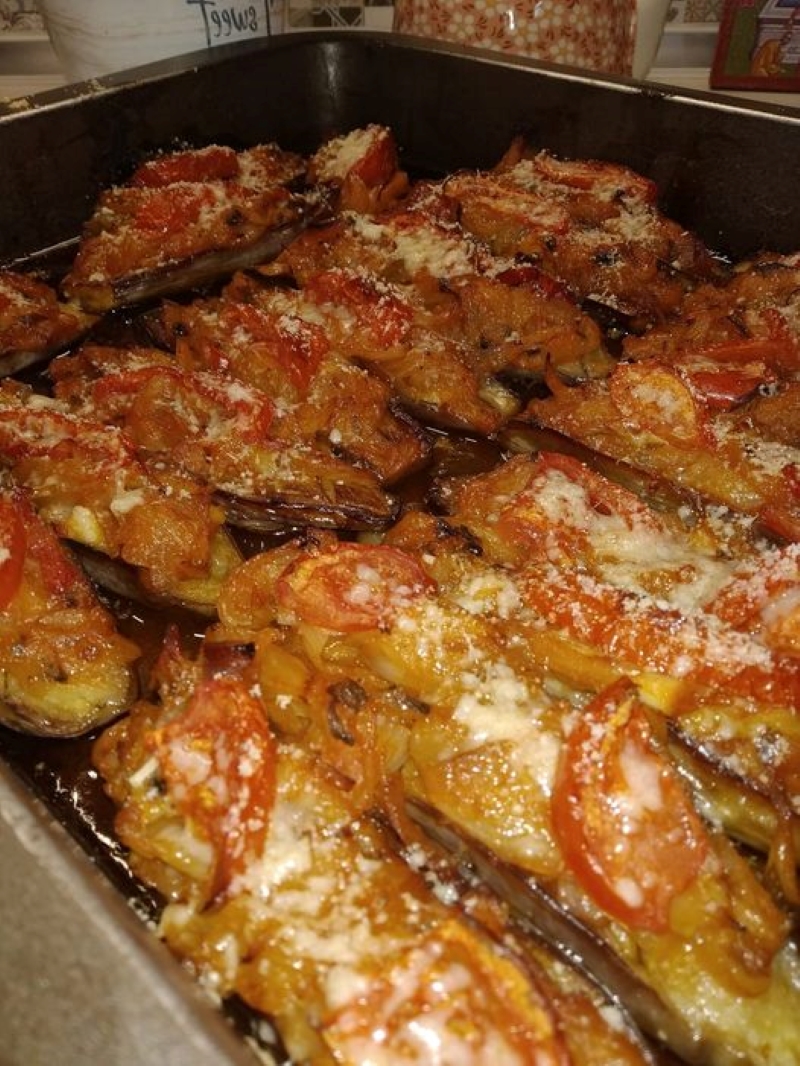 Σε ένα ταψί στρώνουμε τις μελιτζάνες, βάζουμε από πάνω μία κουταλιά ή δύο από τα έτοιμα κρεμμύδια και βάζουμε και μία φετούλα ντομάτα από πάνω.
