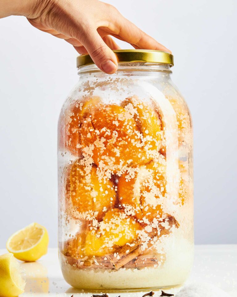 Προσθέτουμε το μυρωδικό ή το μπαχαρικό που επιλέξαμε (αν θέλουμε), περιχύνουμε με τον χυμό λεμονιού και κλείνουμε καλά τη γυάλα.